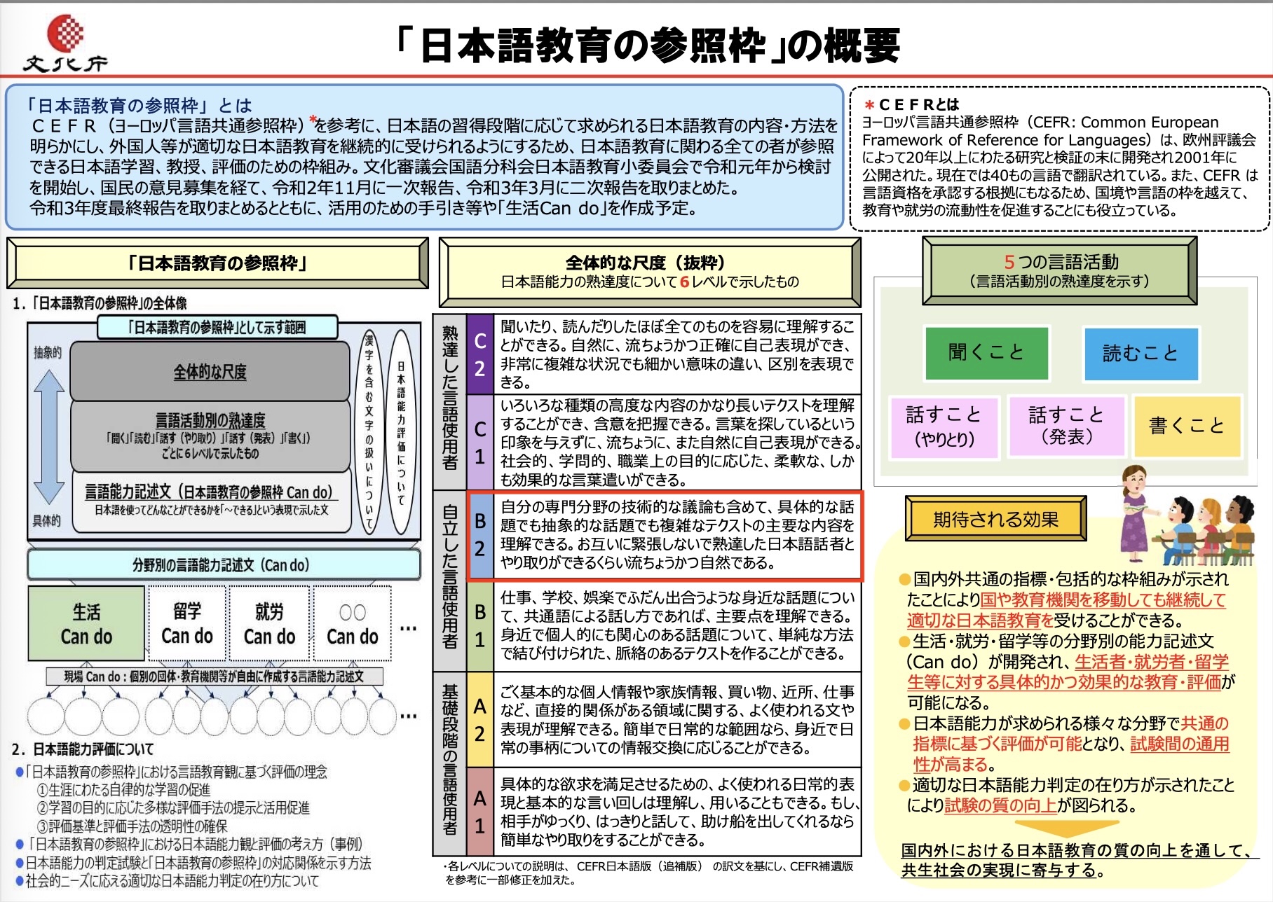 申請者または常勤職員のうち、誰か一人は日本語能力が必要となります。「相当程度の日本語能力」とは,文化庁が公表している「日本語教育の参照枠」にある「B2」レベル以上の日本語能力をさします。